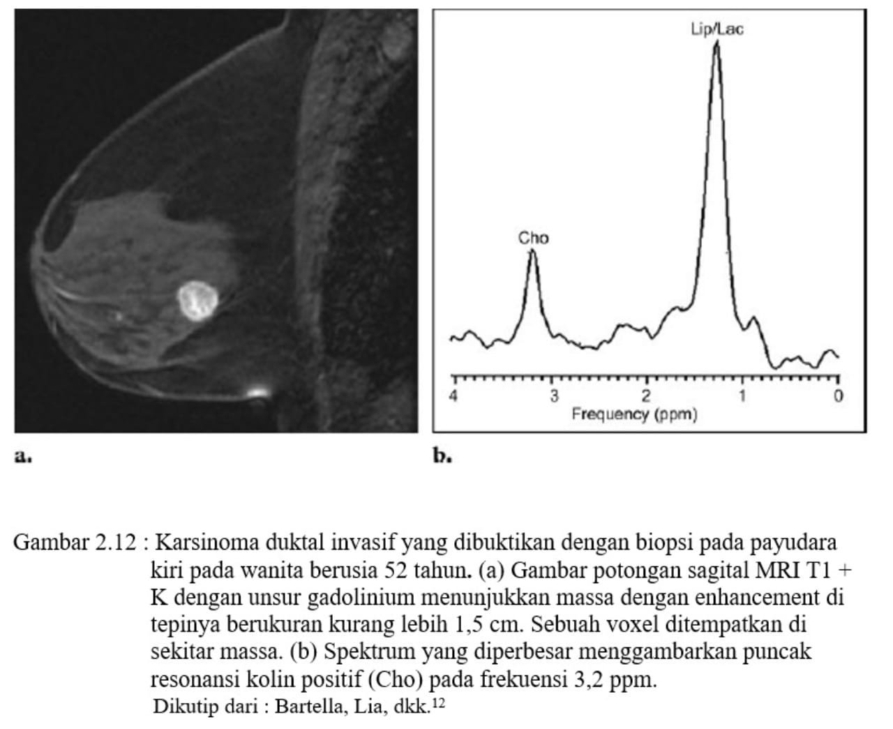 MRS adalah suatu teknik pemeriksaan in vivo dapat dilakukan bersama dengan pencitraan MRI untuk mendapatkan informasi tentang kandungan kimiawi dari suatu lesi pada payudara. Choline yang mengandung senyawa PCho dan phosphoethanolamine (PE) digunakan sebagai prekursor melalui jalur Kennedy untuk sintesis fosfolipid dan fosfotidilkolin (PtdCho) yang kemudian digunakan untuk sintesis membran sel. Beberapa penelitian telah melaporkan konsentrasi tCho pada lesi payudara ganas dan nilai batasnya ( 3,2 ppm ) untuk membedakan jaringan ganas, jinak dan normal.8-11