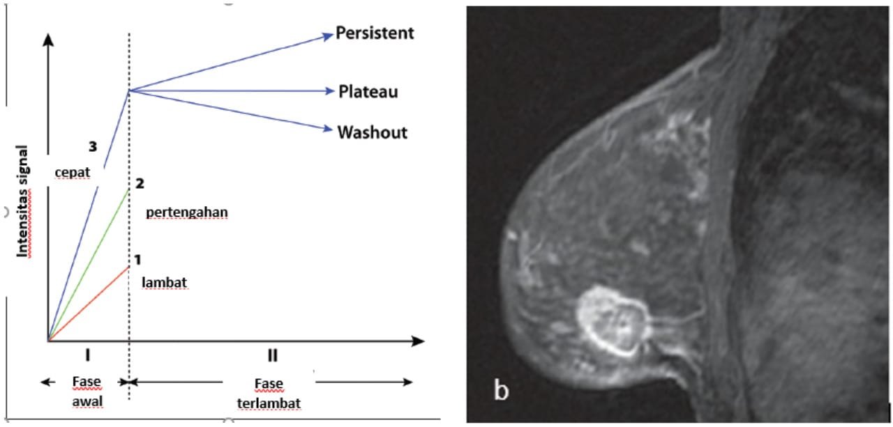 Dynamic Sequence pada pemeriksaan MRI payudara dapat memberikan gambaran kurva kinetik. Kurva kinetik standar adalah pengukuran dinamis di mana peningkatan kadar kontras dan pengeluaran kontras dalam jaringan dipantau selama periode waktu tertentu setelah injeksi kontras diberikan, kurva kinetik pada MRI payudara dibagi menjadi 3 tipe. Kurva Tipe-I kontras perlahan meningkat, di mana peningkatan kontras bertahap dan stabil terjadi selama sekitar 5 menit. Keganasan terlihat pada sekitar 6% pada lesi dengan gambaran kurva Tipe-I. Kurva tipe-II menunjukkan peningkatan kontras yang cepat pada fase awal (meningkat selama periode 1-2 menit) dengan gambaran kurva yang mendatar pada fase lanjutan. Keganasan terlihat pada sekitar 6-29% pada lesi dengan gambaran kurva Tipe-II. Tipe III atau kurva “washout” menunjukkan peningkatan kontras yang cepat pada fase awal (lebih dari 1 – 2 menit), dengan gambaran kurva yang menurun pada fase lanjutan. Hal ini menghasilkan puncak karakteristik yang dijuluki “sudut kanker”, dan sangat terkait dengan keganasan. Keganasan terlihat pada sekitar 29-77% lesi dengan kurva Tipe-III. 15