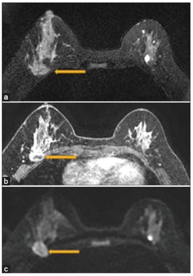 Gambar. Seorang wanita 47 tahun dengan karsinoma invasif payudara kanan yang terbukti dengan biopsi. Pencitraan resonansi magnetik payudara menunjukkan infiltrasi ke otot pectoralis (panah) pada T2 (a), infiltrasi ke otot pectoralis (panah) pada T1+Kontras (b), dan gambaran restricted ( infiltrasi ) ke otot pectoralis (panah) pada DWI (c ). Patologi bedah menunjukkan bukti keterlibatan otot rangka.13